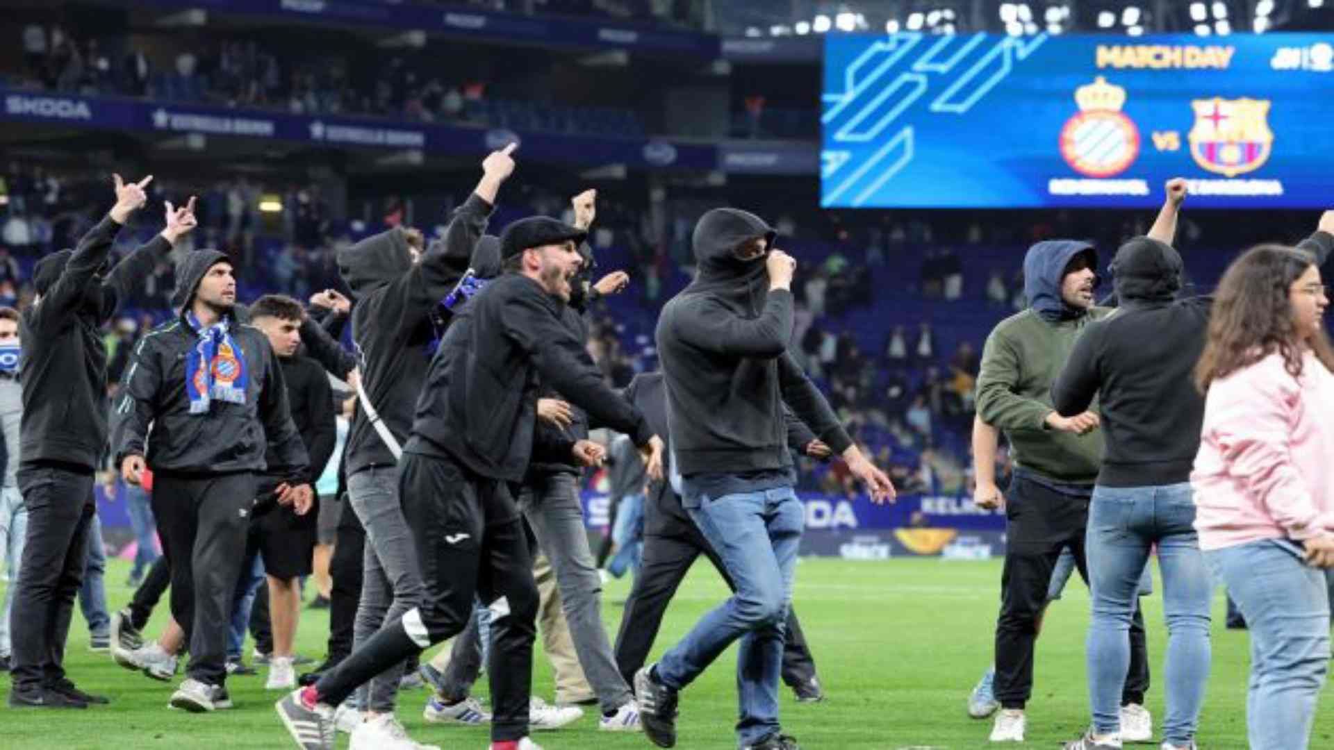 Perdere un derby fa sempre un po’ più male ai tifosi, peggio ancora se la sconfitta determina la vittoria del campionato da parte dei propri “nemici”. Al fischio finale i giocatori di Xavi si sono uniti in un cerchio per festeggiare la vittoria matematica del campionato ma poco dopo i tifosi dell’Espanyol, che non potevano sopportare la scena, hanno invaso il campo e si sono diretti in maniera violenta contro i giocatori blaugrana che hanno capito subito e sono scappati negli spogliatoi.