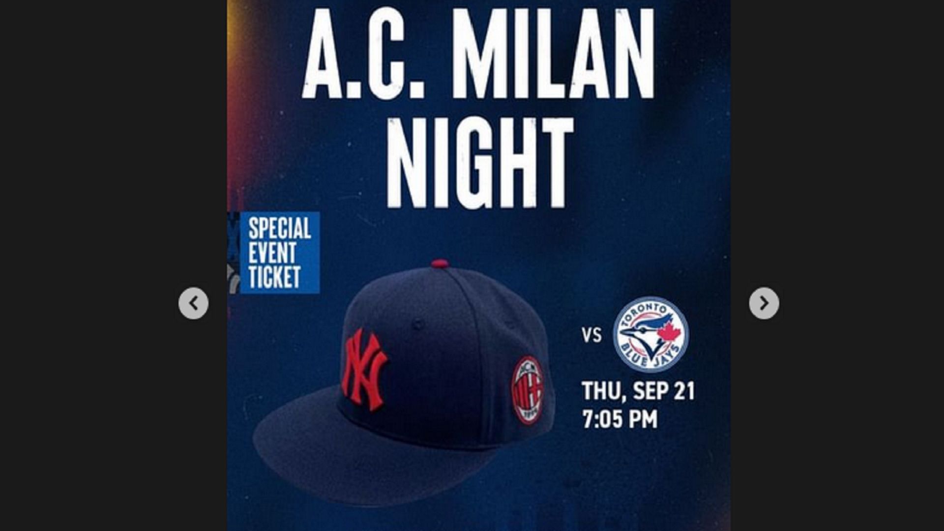 In occasione della gara casalinga dei New York Yankees che si svolgerà il 21 settembre, all’entrata sarà possibile ricevere il cappellino che ha ricamato il logo del Milan e della squadra newyorkese di baseball. Come fare per averlo? Basta acqusitare il biglietto Special Events della gara. Per tutti gli italiani a New York e tifosi milanisti un oggetto da collezione da non farsi sfuggire.