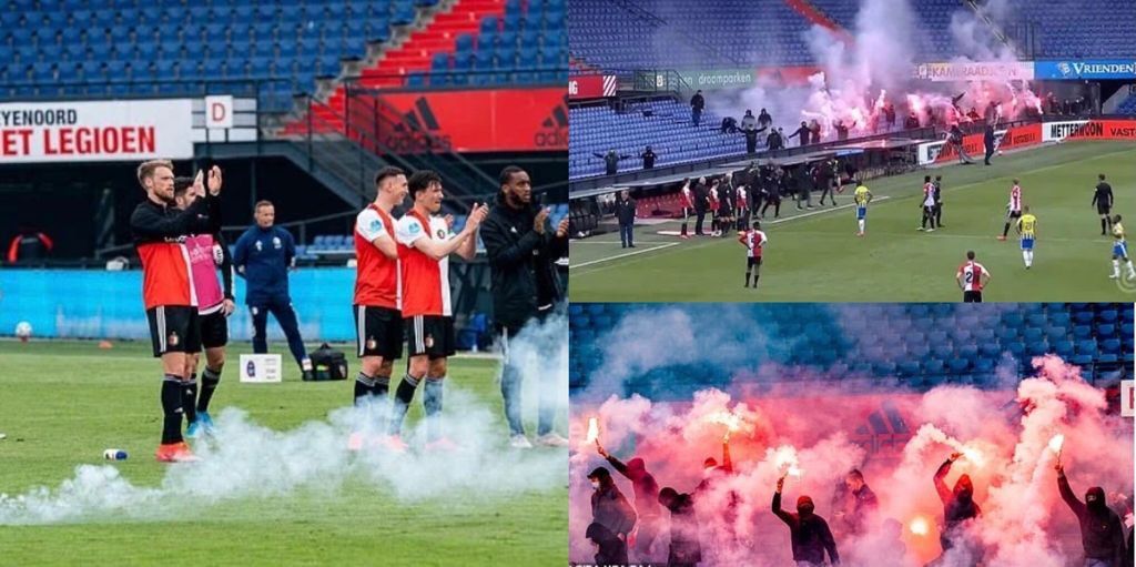 In questo calcio fatto di stadi vuoti e tifosi costretti a sostenere la propria squadra del cuore lontano dalle varie curve può succedere veramente di tutto. Come quanto accaduto in Olanda in occasione dell’ultima gara di campionato nella sfida tra il Feyenoord e l’RKC Waalwijk. Al minuto 66 della partita un folto gruppo di sostenitori dei padroni di casa ha fatto incredibilmente irruzione all’interno dello stadio De Kuip di Rotterdam interrompendone lo svolgimento. Tra razzi, fuochi d’artificio e cori cantati a squarciagola, i supporters del Feyenoord hanno voluto “pacificamente” mostrare il loro sostegno ai propri beniamini, il tutto sotto gli occhi sbigottiti dei giocatori in campo. I quali, dopo alcuni momenti di smarrimento, hanno iniziato ad applaudire i tifosi.