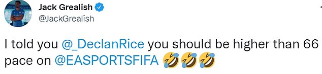 Il primo a congratularsi sui social media con il suo amico Declan Rice per il bellissimo goal messo a segno in Europa League è stato Jack Grealish. Il centrocampista del Manchester City però lo ha fatto mettendo il dito nella piaga su uno degli argomenti più dibattuti tra i calciatori: i valori loro assegnati nel famoso videogioco per consolle Fifa 22. “Te l’avevo detto @_DeclanRice che dovevi avere un valore più alto di 66 come velocità su @EASPORTSFIFA“, ha scritto Grealish su Twitter aggiungendo delle emoticon con faccine che ridono a crepapelle.