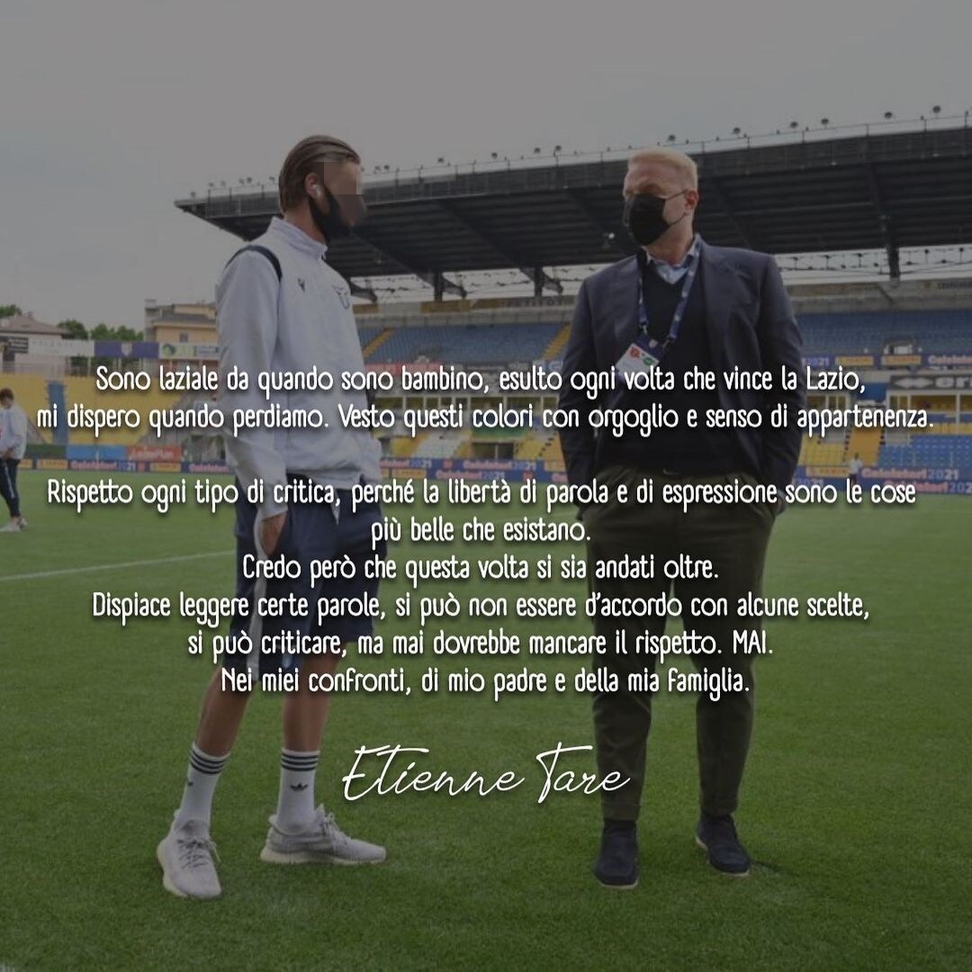 Sono arrivate minacce ed irripetibili insulti social a Tare e a suo figlio Etienne dopo la chiusura del calciomercato. Un calciomercato che, evidentemente, non ha soddisfatto una parte della tifoseria della Lazio nonostante gli arrivi di Felipe Anderson, Basic, Hysaj, Luka Romero, Pedro e Zaccagni. Il 17enne figlio del direttore sportivo biancoceleste ha pubblicato alcuni degli insulti ricevuti rispondendo per le rime alle intimidazioni di questi presunti “tifosi”.