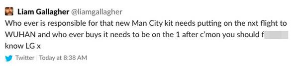 Un tweet con un bersaglio più che nitido, ossia i creatori della nuova terza maglia del City: “Chiunque sia il responsabile per quella nuova maglia del Man City sia messo sul prossimo volo per Wuhan e chiunque la comprasse sia piazzato sul volo successivo, c**** dovreste saperlo“, recita il post molto poco politicamente corretto. Un’uscita sfrontata e senza mezze misure e sicuramente molto poco felice. Ovviamente il tweet, poi rimosso, ha scatenato la reazione scioccata dei tabloid inglesi, da sempre pronti a puntare il dito contro l’ex frontman degli Oasis. Un commento che non è passato inosservato dunque, tra i tanti commenti negativi dei tifosi Citizens. Critiche comunque sicuramente più pacate di quelle di Liam Gallagher. Tra queste il Mirror ne cita una in particolare: “Ogni volta che vedo uno di questi design hipster, maledico il giorno in cui abbiamo firmato il contratto con Puma“.