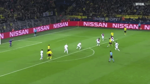 Questo fatto in Champions è tra gli assist più belli di Sancho, e arriva in Champions League, tanto per dimostrare che probabilmente è così immerso nella modalità fine-adolescenza-inizio-carriera-da-fenomeno che l’inconsapevolezza regna e non sembra importargli più di tanto che la grande giocata arrivi col Norimberga o in Champions con il Monaco o l’Atletico Madrid. Questo assist per Reus è un gesto di grande maturità: Sancho stringe la sua corsa verso il centro e aspetta che siano in tre ad abboccare al suo movimento per dare un passaggio filtrante al suo attaccante, ormai lasciato solo dalla difesa. L’azione inizia a rendere l’idea che Sancho non sia solo un giocatore corsa/dribbling/skills, ma anche uno che ha un’idea chiara di quello che succede attorno a lui e di uno che ha capito perfettamente in che sistema gioca, in quali spazi mandare la palla e quando correrà il compagno a prenderla.