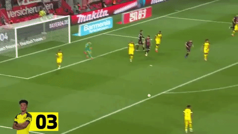 Questa azione è importante, perché forse è qui che nella testa di Favre scatta l’idea: considerare Sancho come un titolare. Un po’ di contesto per capire in che partita ci troviamo: al momento dell’azione siamo al 69′, Sancho è entrato trenta secondi prima e il Dortmund ha dimezzato lo svantaggio due minuti prima con Bruun Larsen (altro 2000 da annotare). Il Leverkusen si getta in avanti per riportarsi sul +2, ma non fa i conti con l’immediata capacità di Sancho di entrare on fire nelle partite. La difesa di casa ci mette anche molto a decidere di correre indietro nel campo, nessuno si aspetta che Sancho dia quel colpetto con l’esterno che gli consente di far scivolare a terra un calciatore e convincersi del coast to coast. L’inglese avanza palla al piede sulla fascia destra, per un attimo temporeggia, non è chiaro se per un controllo imperfetto o per l’improvvisa visione di un nuovo avversario sulla strada. In quel momento trova una buona connessione con Reus che si era intelligentemente abbassato a centrocampo per dare una mano al compagno e portarsi la palla avanti in conduzione. Sancho crede nel duetto, con uno scatto brucia il suo marcatore e si fa consegnare palla da Reus, salvo ridargliela immediatamente dopo per consentirgli di pareggiare. Da qui in poi Sancho diventerà titolare, e tanto per la cronaca quella partita finirà 2-4 con una doppietta dell’instancabile Alcacer (l’ultimo assist? Ancora di Sancho).