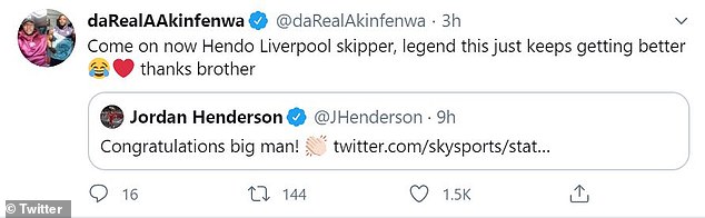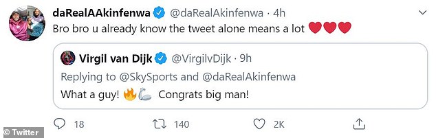 Anche il capitano del Liverpool Jordan Henderson e il difensore dei Reds Virgil Van Dijk si sono voluti congratulare con Akinfenwa per la promozione appena ottenuta. Henderson ha twittato: “Congratulazioni grande uomo“, tweet a cui l’attaccante ha prontamente risposto: “Andiamo Hendo! Capitano del Liverpool, leggenda continua a migliorare. Grazie Fratello“. Il difensore olandese ha scritto: “Che ragazzo! Complimenti grande uomo!” Akinfenwa ha risposto: “Fratello, sai già che il Tweet da solo significa molto“. Una serata veramente indimenticabile per Akinfenwa, da sempre grande sostenitore del Liverpool.