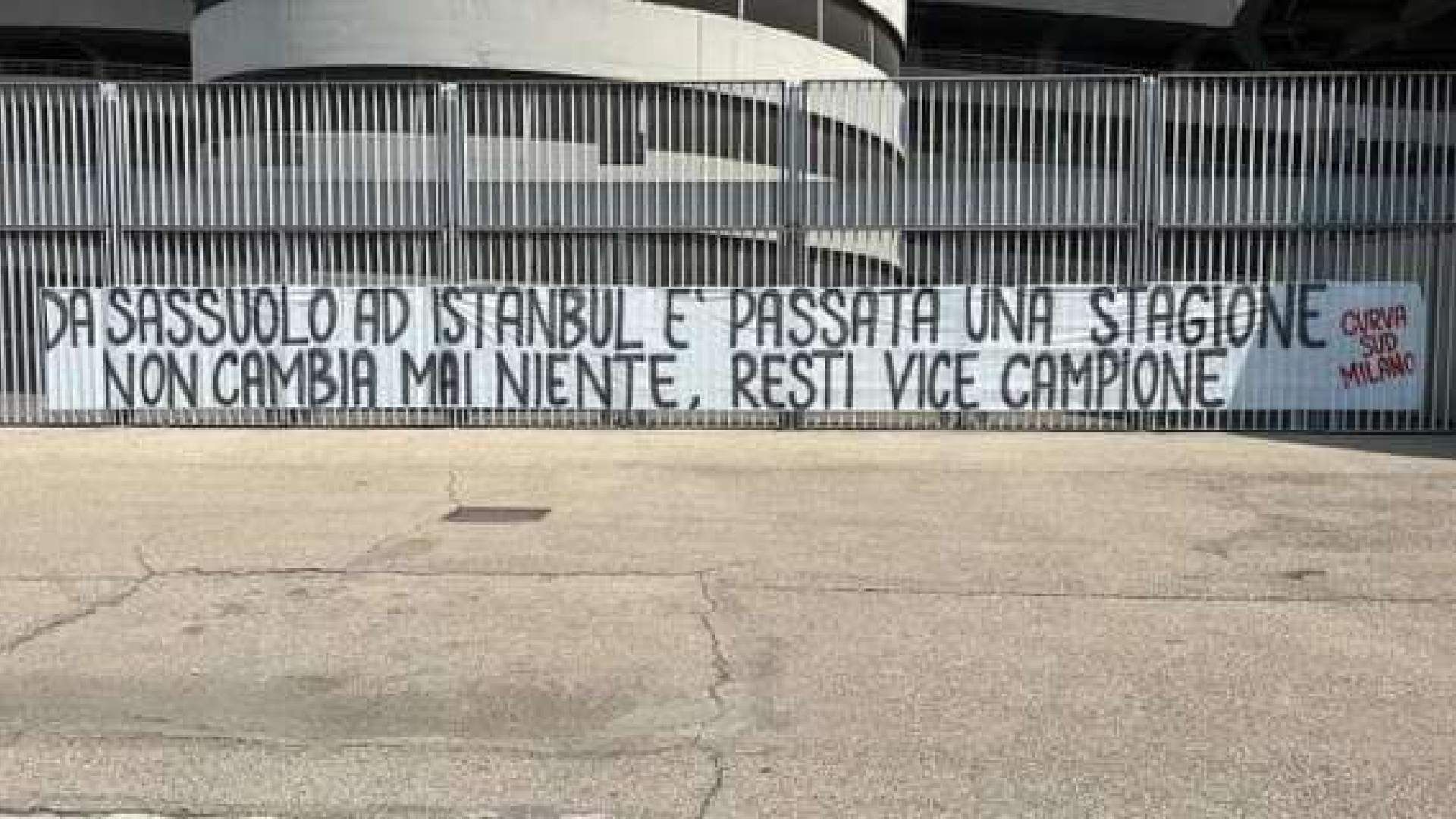 Era inevitabile che l’Inter sconfitta nella finale di Champions League contro il Manchester City giocata sabato sera a Istanbul avrebbe reso felici i cugini del Milan. E i tifosi rossoneri hanno approfittato del mancato arrivo del trofeo nella bacheca nerazzurra per prendersi gioco dei rivali cittadini. A Milano sono comparsi alla spicciolata tanti striscioni esposti dalla Curva Sud del Milan. Uno sfottò che ci si poteva aspettare, figlio probabilmente dello “scampato pericolo”…