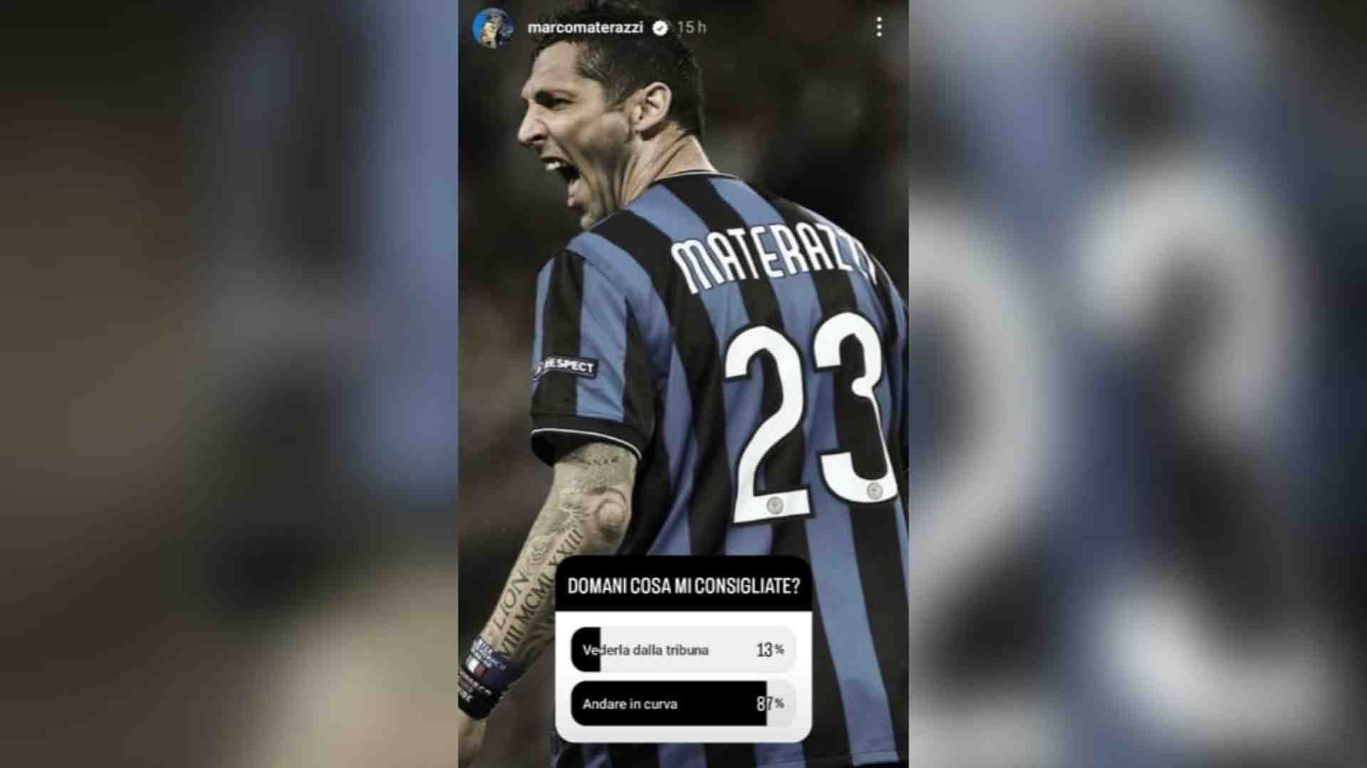 Marco Materazzi, ex bandiera della difesa dell’Inter nonché campione d’Europa nel 2010, ha pubblicato un sondaggio nelle sue stories Instagram in cui ha lasciato la scelta al suo pubblico. Alla domanda: “Cosa mi consigliate?”, Marco mette come opzioni: “Vederla dalla tribuna” o “Andare in curva”. Il suo pubblico social non gli ha lasciato scampo perché l’87% degli utenti ha votato per la seconda opzione.
