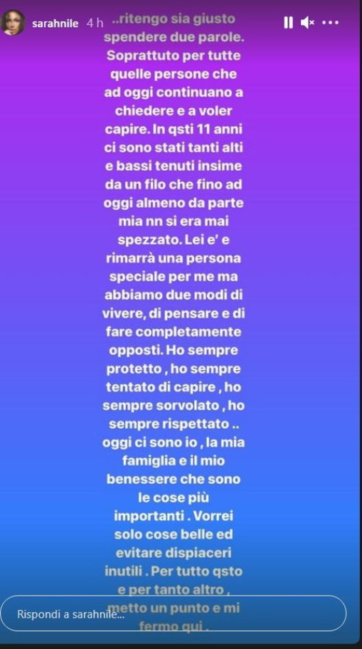 “Lei è e rimarrà una persona speciale per me ma abbiamo due modi di vivere, di pensare, di fare completamente opposti“, ha aggiunto la ex gieffina in un’altra Stories. “Ho sempre protetto, ho sempre tentato di capire, ho sempre sorvolato, ho sempre rispettato… Oggi ci sono io, la mia famiglia e il mio benessere che sono le cose più importanti. Vorrei solo cose belle ed evitare dispiaceri inutili. Per tutto questo, metto un punto e mi fermo qui“.