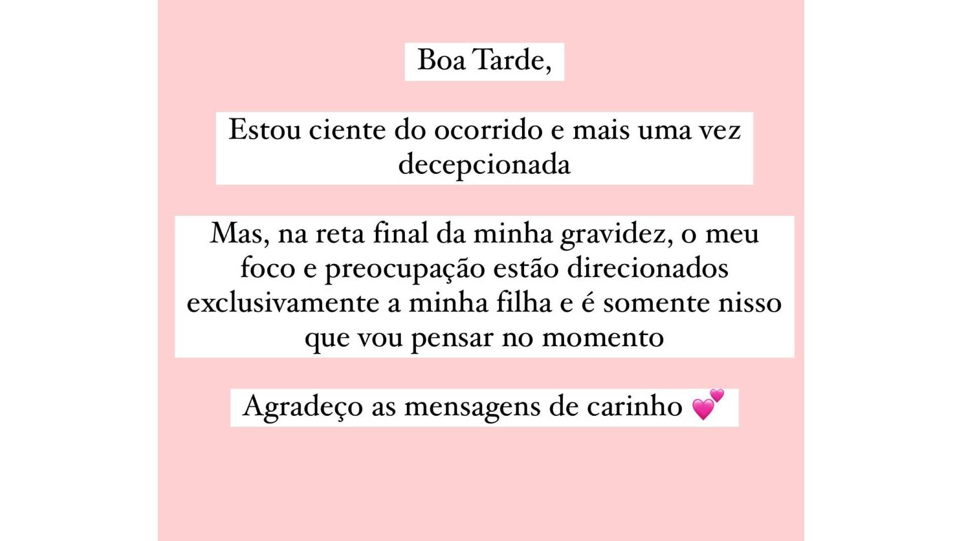 “Buon pomeriggio, sono consapevole di quello che è successo e ancora una volta sono delusa“, ha scritto la compagna di Neymar in una storia Instagram. “Ma nella fase finale della mia gravidanza, la mia attenzione e preoccupazione sono dirette esclusivamente a mia figlia e questo è tutto ciò a cui penserò al momento. Apprezzo i messaggi di affetto“, ha concluso.