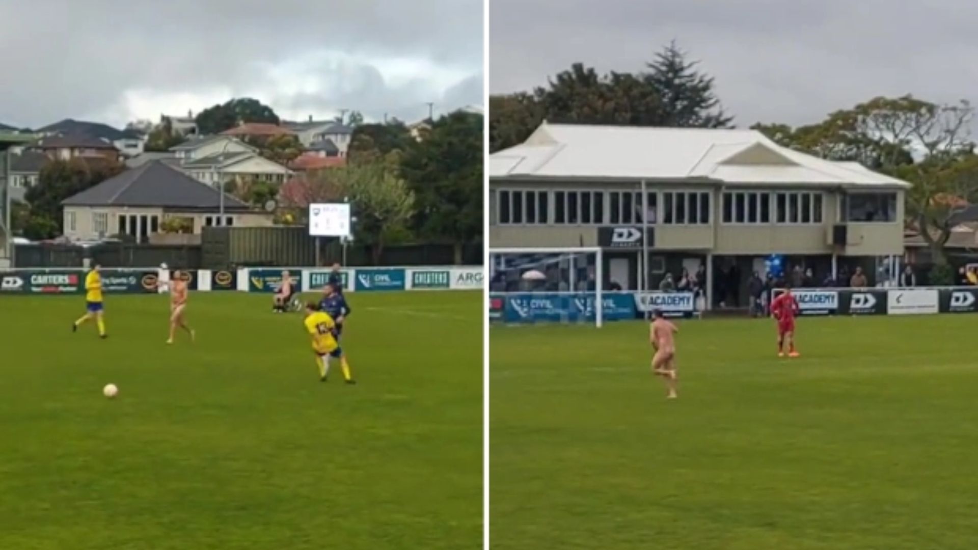 Due uomini nudi, di cui uno in sedie a rotelle, hanno invaso il campo durante una partita in Nuova Zelanda.