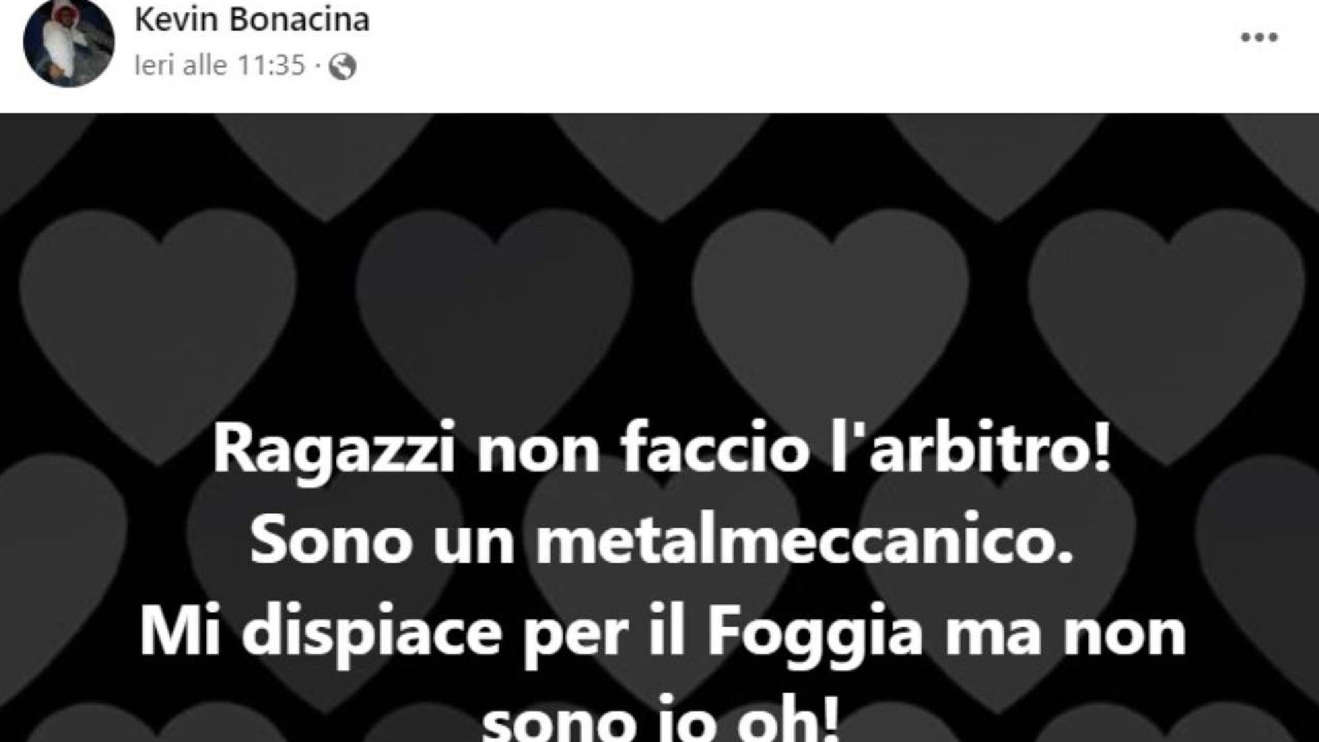 Al termine dell’incontro, i tifosi del Foggia si sono infiammati sui social, adirati con l’arbitro per la gestione degli episodi. É partita subito “la caccia all’uomo”, alla disperata ricerca del profilo del direttore di gara. Trovato il presunto account, è partito il putiferio. Insulti e attacchi al povero e innocente Kevin Bonacina, che ha risposto così: “Ragazzi non faccio l’arbitro! Sono un metalmeccanico. Mi dispiace per il Foggia ma non sono io, oh!”.