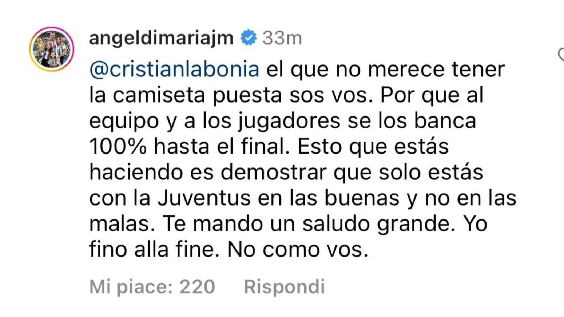 Il clima in casa Juventus non può essere dei migliori. Lunedì è stata una giornata tragica: prima la nuova stangata della Corte d’Appello, che ha nuovamente inflitto al club una penalizzazione, stavolta di 10 punti, poi la durissima sconfitta subita per 4-1 in casa dell’Empoli. I tifosi sono arrabbiati, sia con il “sistema” che con squadra e società, e le polemiche interne all’ambiente juventino sono ormai all’ordine del giorno. Chiara dimostrazione è il botta e risposta social avvenuto tra Angel Di Maria ed un tifoso.