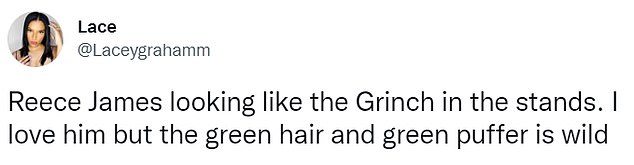 A completare il look di James, una giacca verde abbinata al colore dei capelli. E qualcuno, proprio a causa di questa scelta, ha notato una certa somiglianza: “Reece James sembra il Grinch sugli spalti. Lo adoro”. Un altro ha aggiunto ironicamente: “Un grande fan di Reece James che coordina i suoi capelli con il suo cappotto”.